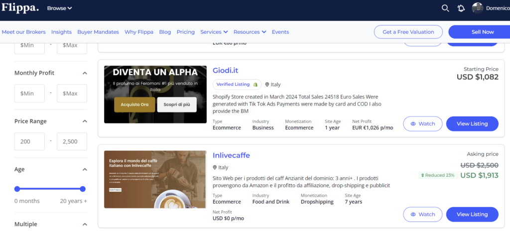 Flippa è un marketplace globale che consente agli utenti di acquistare e vendere una vasta gamma di asset digitali, tra cui siti web, domini, app e attività e-commerce.