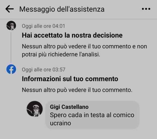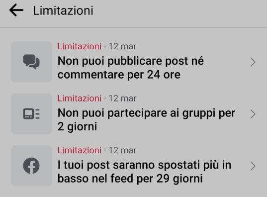 Io ci ho provato. Il risultato? Dopo un paio di minuti il commento è stato (giustamente) oscurato e l’account bloccato per 24 ore senza possibilità di pubblicare post, né commentare, con l’impossibilità per 2 giorni di poter partecipare ai gruppi e con i post che saranno spostati più in basso nel feed per 29 giorni.