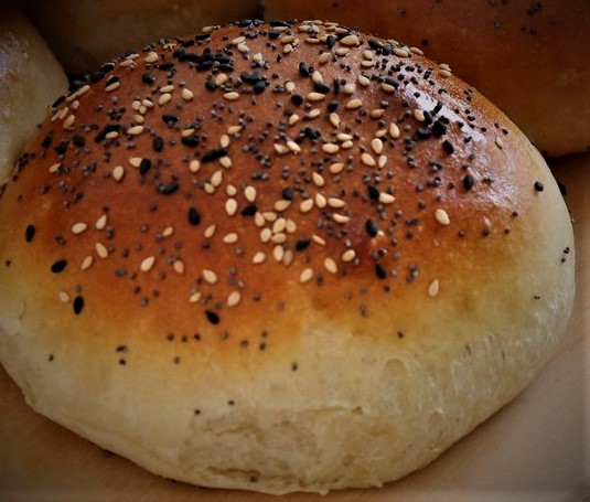 Panini con Burger di fagioli al curry e alloro, con salsa allo yogurt di soia e contorno di finocchi