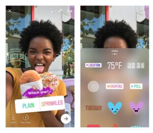 Sulle storie ci sono una serie di adesivi facili e veloci da usare come sondaggi, domande, countdown, quiz ed emoji per citarne alcuni.
